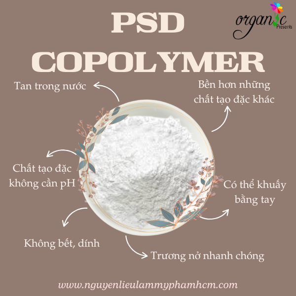 PSD Copolymer là một chất tạo đặc tan trong nước nhanh chóng mà không cần điều chỉnh pH như carbomer, có thể trương nở hoàn toàn trong môi trường pH thấp.