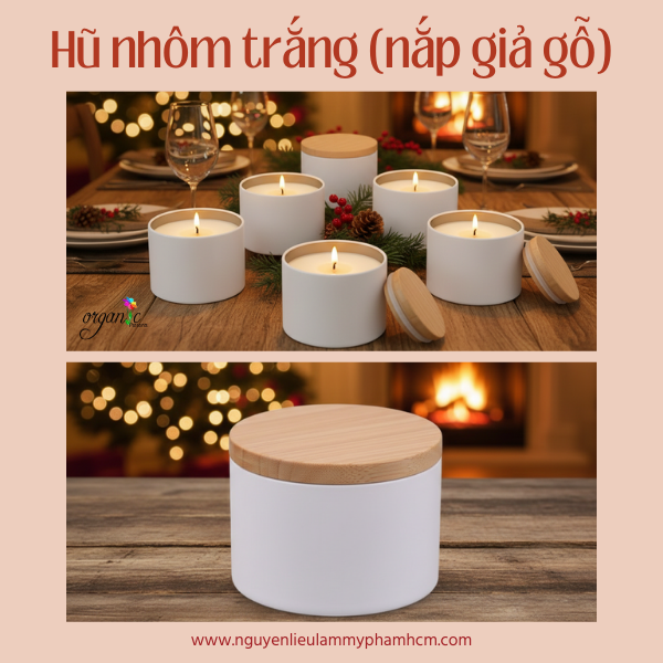 Hũ nhôm hình trụ tròn, với chất liệu nhôm cao cấp, nhẹ, bền và dẫn nhiệt ổn định, đảm bảo an toàn khi đốt nến. Điểm nhấn độc đáo là phần nắp có vân gỗ đẹp, giúp hũ nến trông sang trọng, gần gũi với thiên nhiên, và giữ trọn hương thơm.