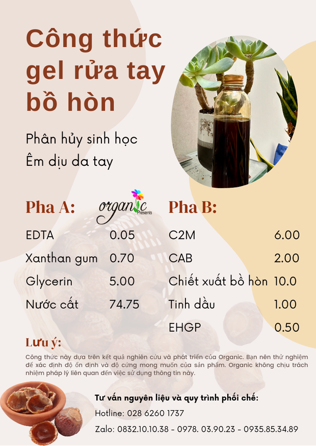 Gel rửa tay thảo mộc được phối chế từ chiết xuất bồ hòn, không dùng chất tẩy rửa mạnh, cùng hàm lượng dưỡng ẩm cao cho da tay mềm mại, mịn màng, không bị cảm giác khô căng sau khi sử dụng. Gel rửa tay còn chứa tinh dầu thiên nhiên cho mùi hương thoang thoảng, dễ chịu. Cùng Organic bắt tay làm sản phẩm này nhé!