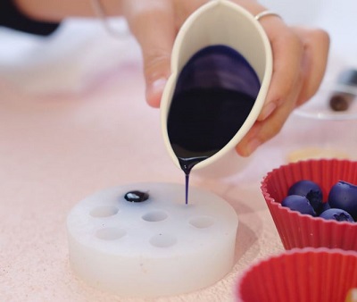- Tương tự, bạn đổ sáp nến lỏng vào các khuôn silicone nhỏ có hình dạng mà mình mong muốn (phối màu phù hợp) để làm các chi tiết trang trí cho thỏi nến chính.