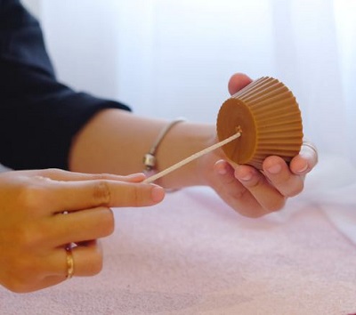 - Sau khi để yên 10 - 15 phút cho sáp nguội lại, bạn dùng tăm/ cây xiên thịt nướng BBQ, đâm vào chính giữa hỗn hợp sáp nến để tạo lỗ xỏ bấc nến.