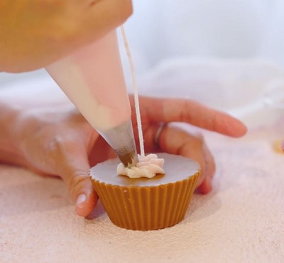 Đun nóng chảy sáp đậu nành trong cốc, chờ cho sáp đậu nành nguội dần, sệt lại. Bạn dùng máy đánh trứng, đánh cho tơi sáp lên, cho phần sáp này vào túi bắt kem. Dùng hai túi khác nhau cho hai màu (nếu thích). Cắt đầu túi thứ ba, cho chuôi bắt kem vào; sau đó cho cả hai túi sáp này vào túi đã có sẵn chuôi. Bắt đầu bắt sáp từ tâm ra xung quanh.
