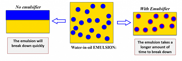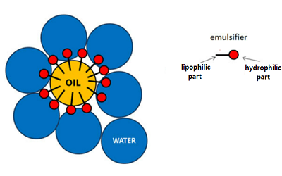 Chính vì điều này, chất nhũ hóa giữ các phân tử dầu tách biệt khỏi nước giúp cho sự đối kháng mạnh mẽ tại bề mặt của dầu và nước giảm đáng kể, kết quả hình thành nên hệ nhũ tương bền đẹp.