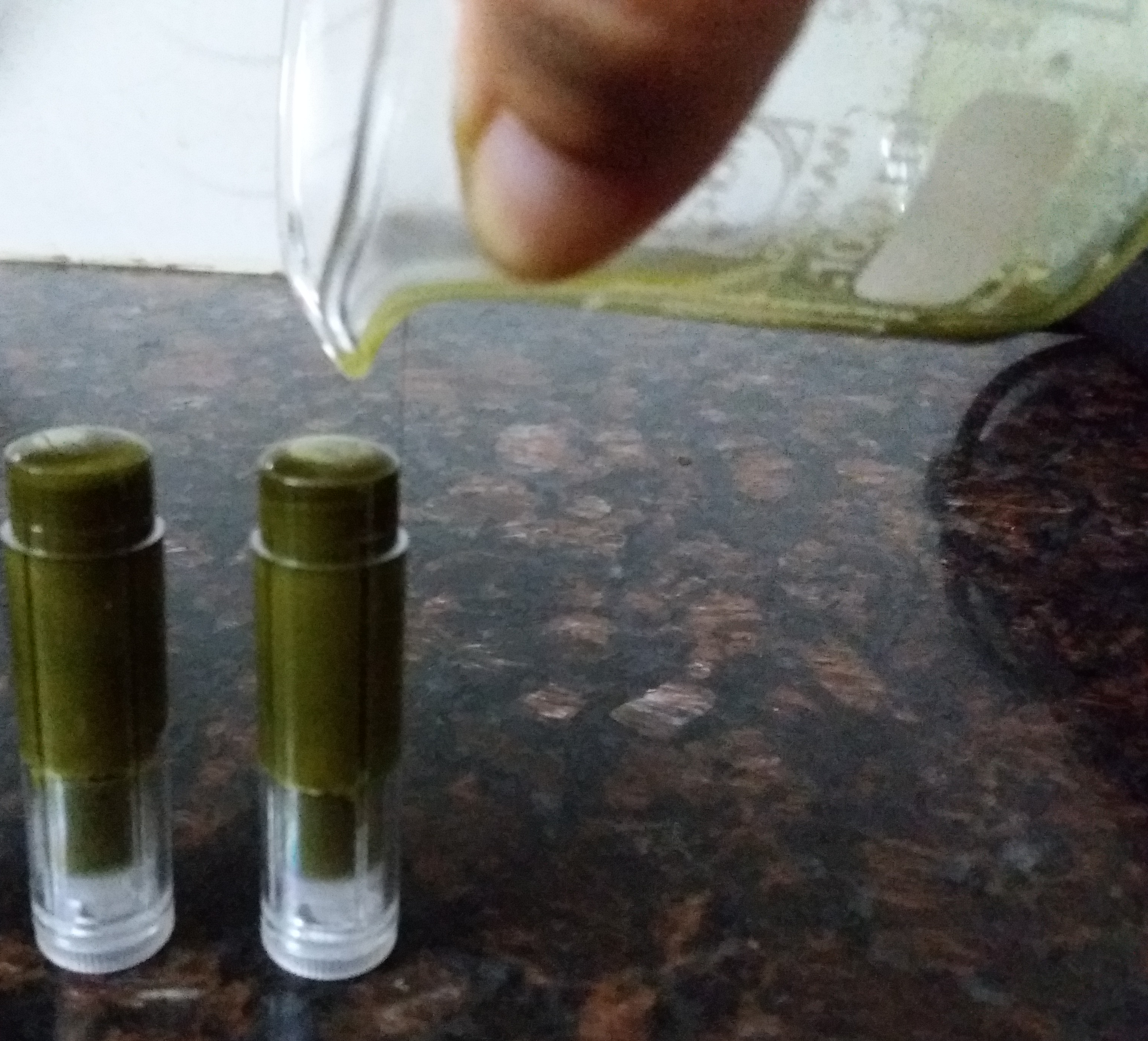 - Nhanh tay đổ hỗn hợp vào khuôn, hoặc vỏ son đổ dứt khoát để mặt son được mịn.