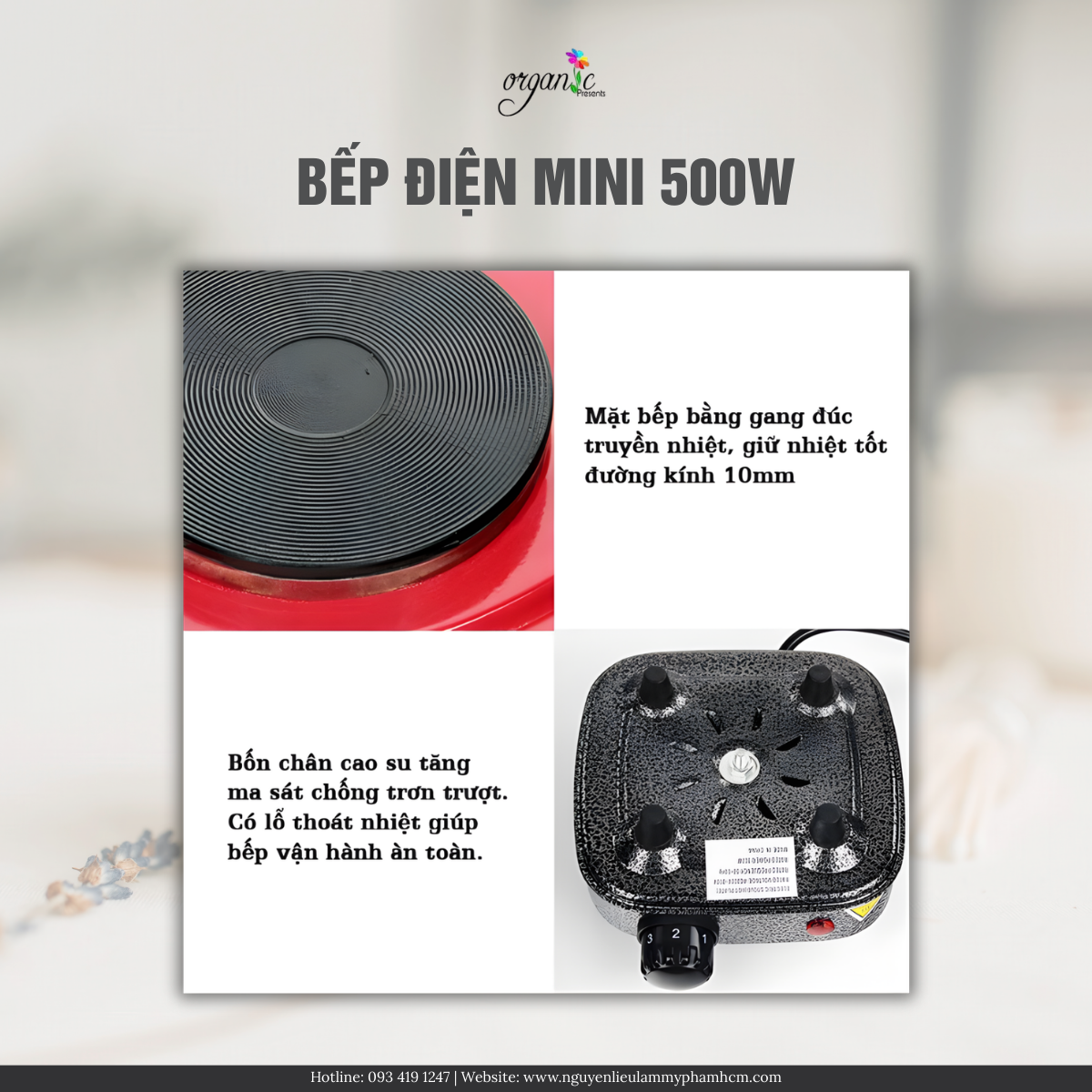 Bếp điện mini 500W được thiết kế nhỏ gọn với kích thước khoảng 13cmx13cmx7cm, phù hợp sử dụng trên bàn làm việc hoặc trong các không gian hạn chế diện tích. Mặt bếp gang có đường kính khoảng 10 cm, giúp truyền nhiệt tương đối đều và ổn định trong quá trình đun nấu sáp, dầu hoặc các nguyên liệu làm mỹ phẩm handmade.