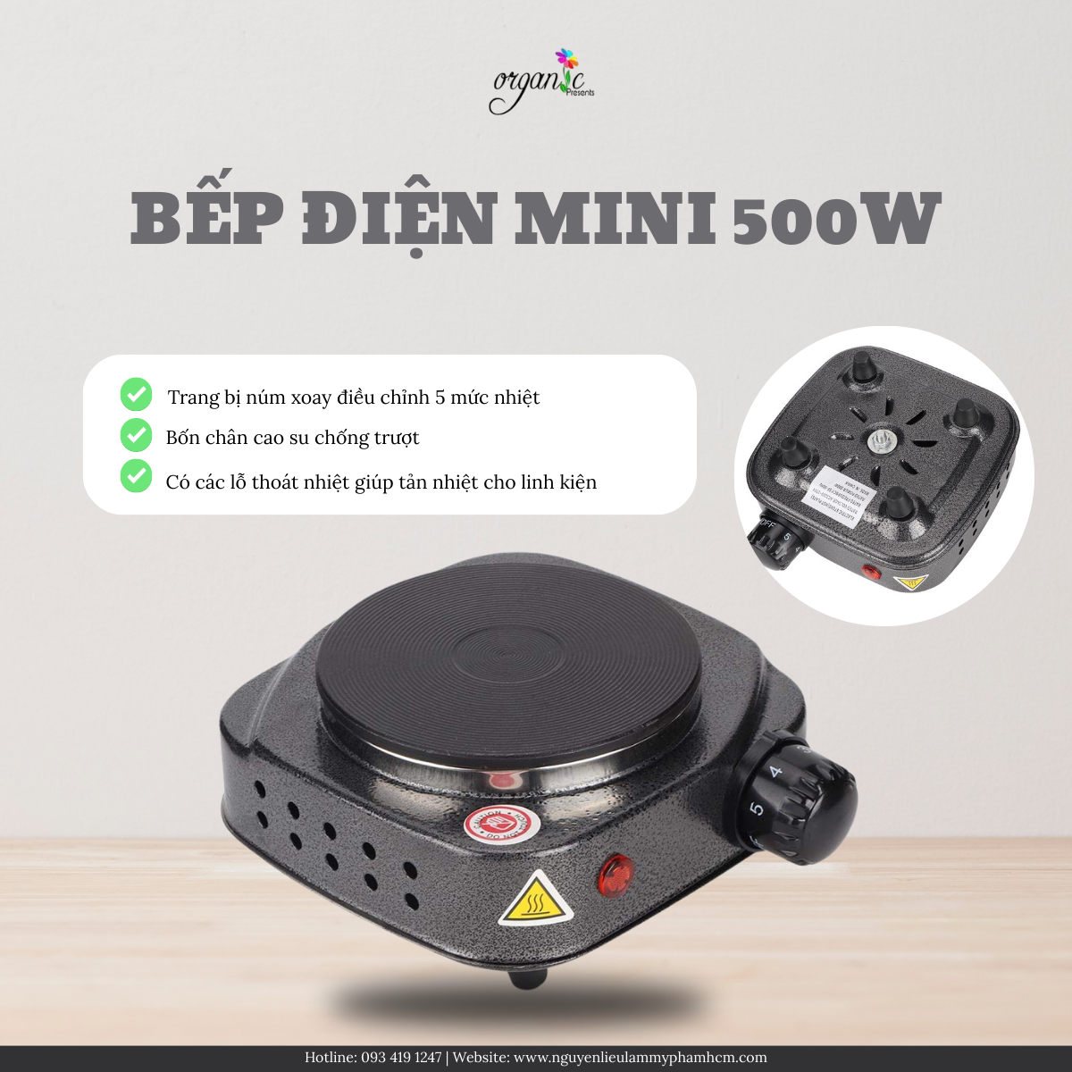 Phù hợp cho không gian nhỏ: Nhờ thiết kế nhỏ gọn, bếp điện mini 500W phù hợp sử dụng trong các không gian hạn chế như bàn làm việc nhỏ, phòng trọ, ký túc xá hoặc mang theo khi đi dã ngoại, workshop hoặc làm đồ thủ công.