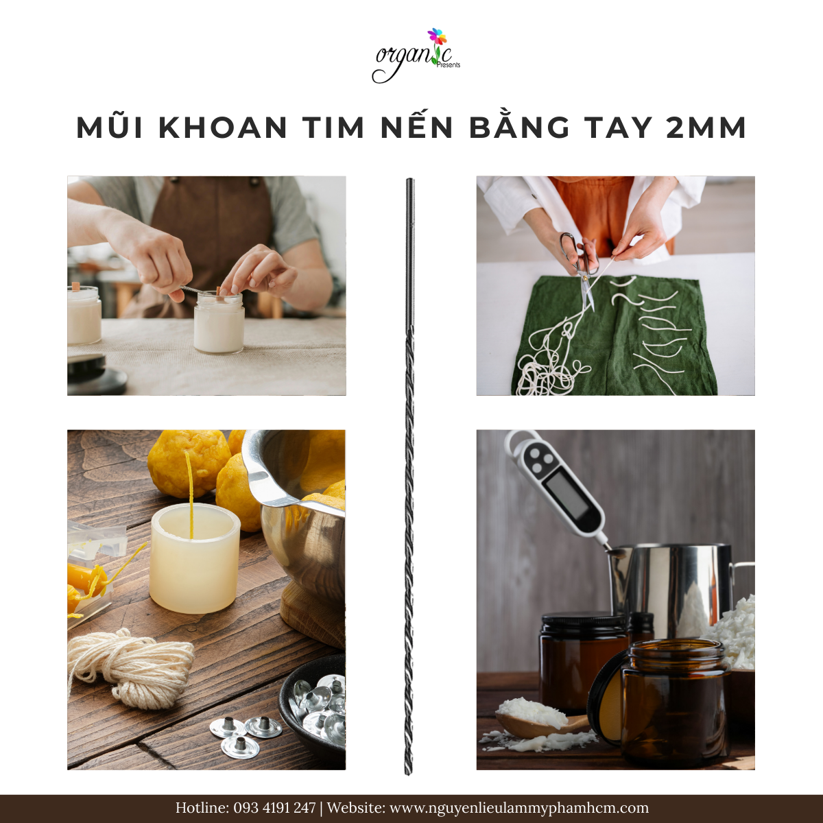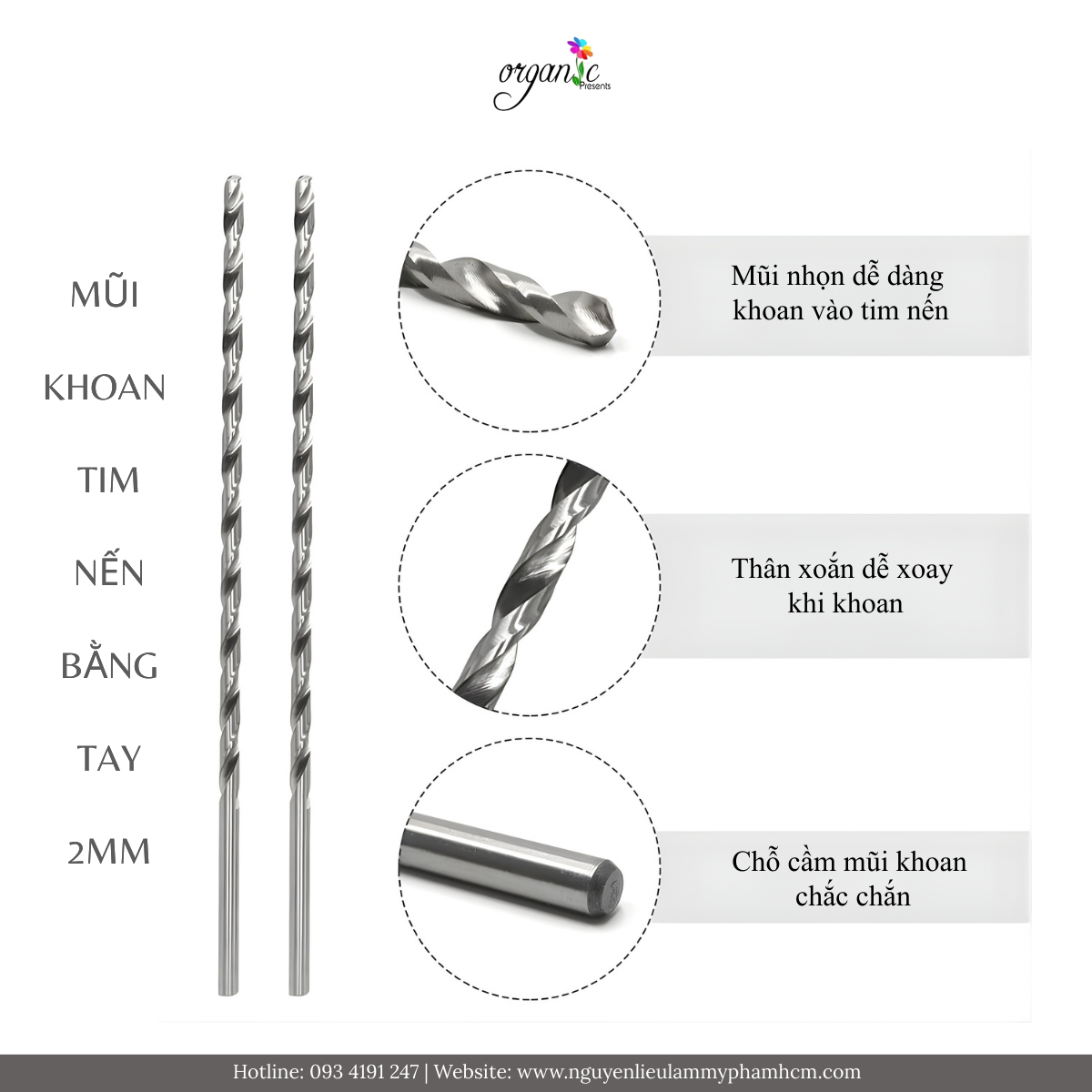 Mũi khoan tim nến bằng tay 2mm là dụng cụ chuyên dùng để tạo lỗ xỏ tim cho các loại nến trụ, nến đúc khuôn hoặc nến handmade. Phần thân mũi khoan có dạng xoắn dài giúp cắt xuyên lớp sáp một cách ổn định khi xoay bằng tay. Với đường kính khoảng 2mm, dụng cụ tạo ra lỗ vừa vặn cho nhiều loại bấc cotton hoặc bấc sáp thường dùng trong làm nến.