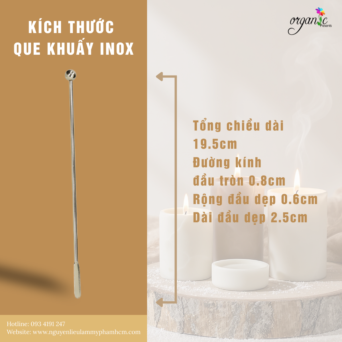 Hòa trộn tinh dầu khi làm nến thơm: Khi làm nến handmade, tinh dầu cần được hòa tan hoàn toàn vào sáp nóng chảy để mùi hương lan tỏa đồng đều. Que khuấy inox giúp khuấy trộn nhẹ nhàng nhưng hiệu quả, hỗ trợ tinh dầu phân tán đều trong sáp và giúp thành phẩm nến có chất lượng ổn định hơn