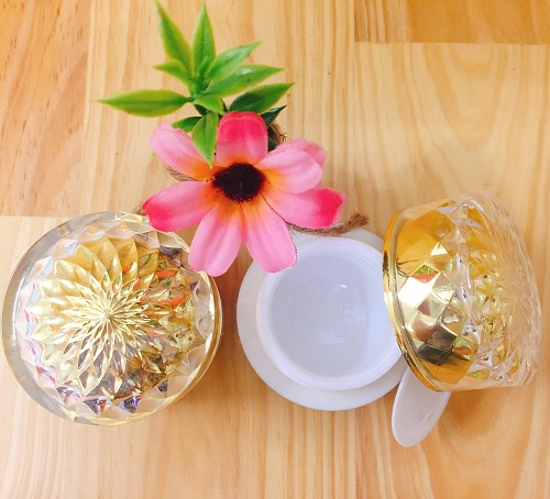 - Hũ kem đựng mỹ phẩm hình khối hoa màu vàng sang chảnh, nắp cùng màu có viền cạnh tinh xảo. phía trong có lớp lót trên hũ. .