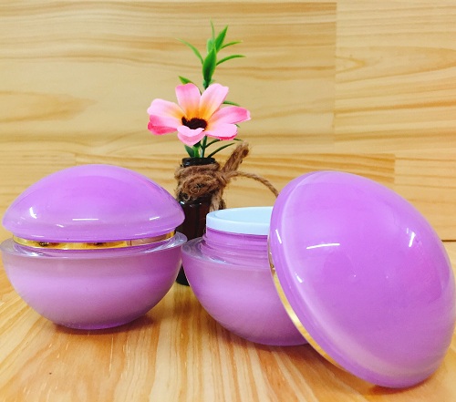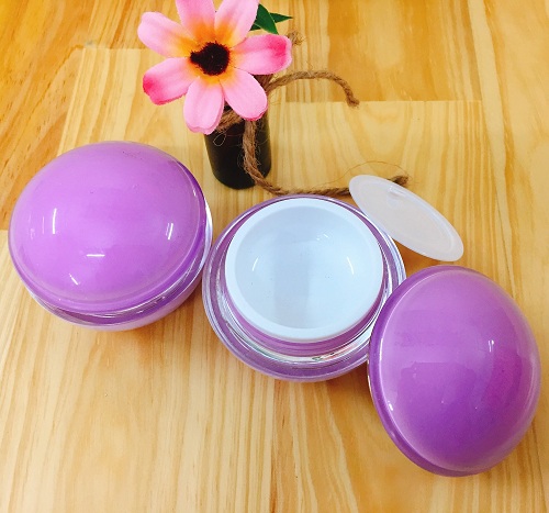 - Hũ kem đựng mỹ phẩm hình khối cầu màu tím nhẹ nhàng, nắp cùng màu có viền quanh thân tinh xảo. phía trong có lớp lót trên hũ. .