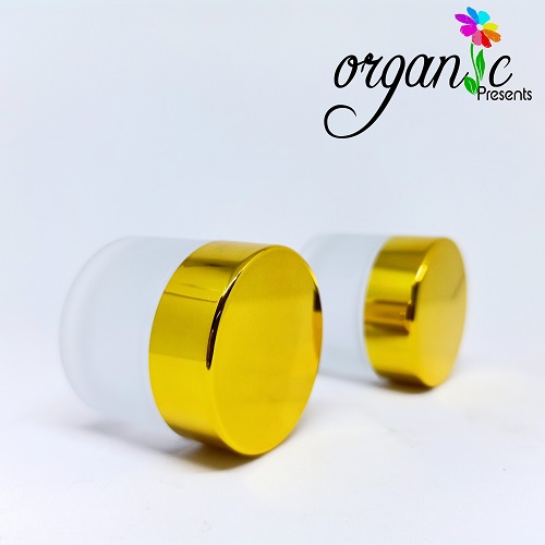 - Hũ đựng mỹ phẩm bằng thủy tinh màu trắng phun sương mờ, nắp nhôm vàng đồng tinh xảo. phía trong có lớp lót trên hũ.