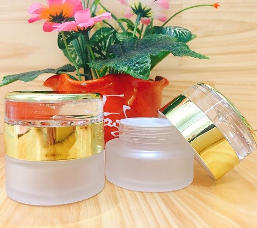 - Hũ đựng mỹ phẩm thủy tinh phủ mờ, nắp vàng có giọt nước bên trong.