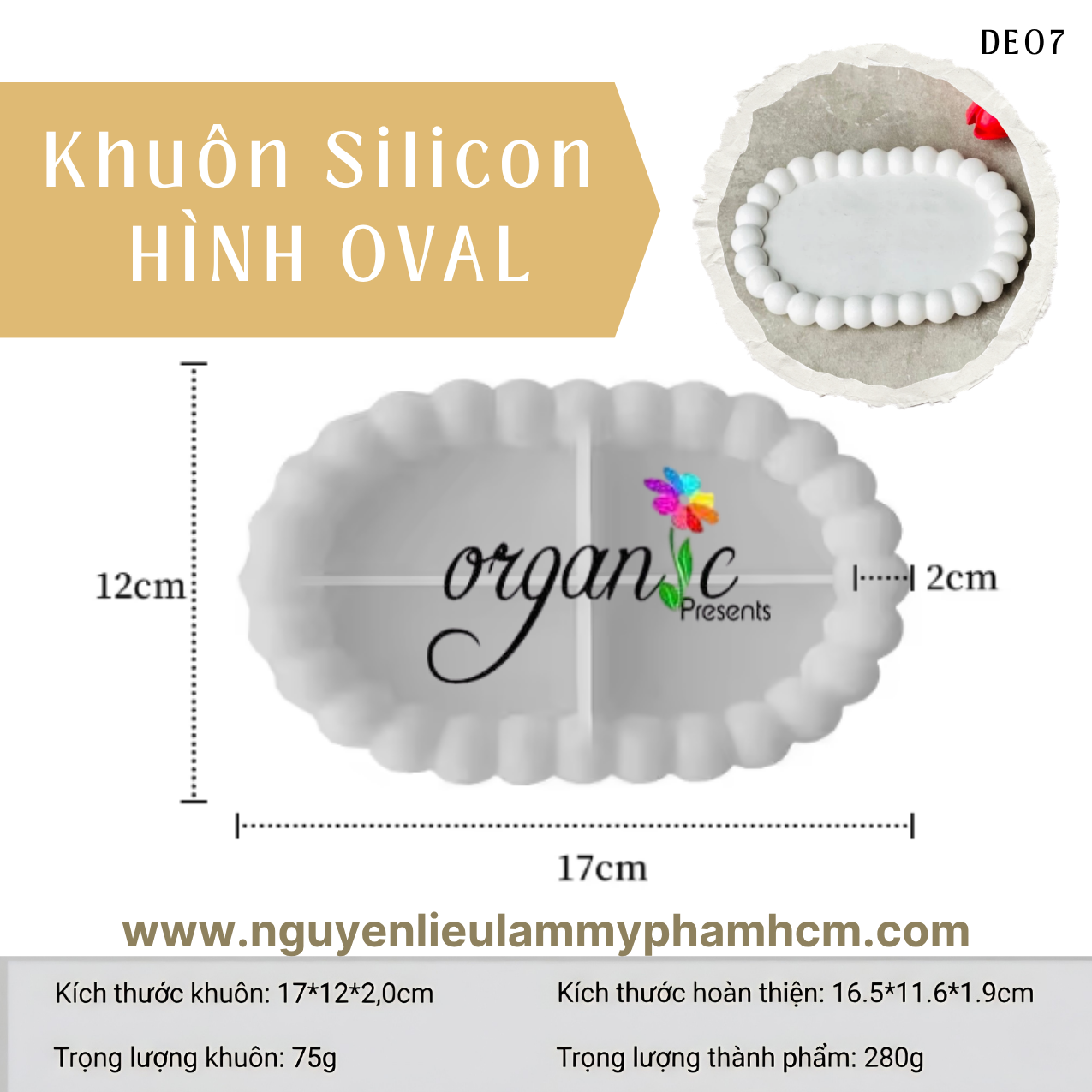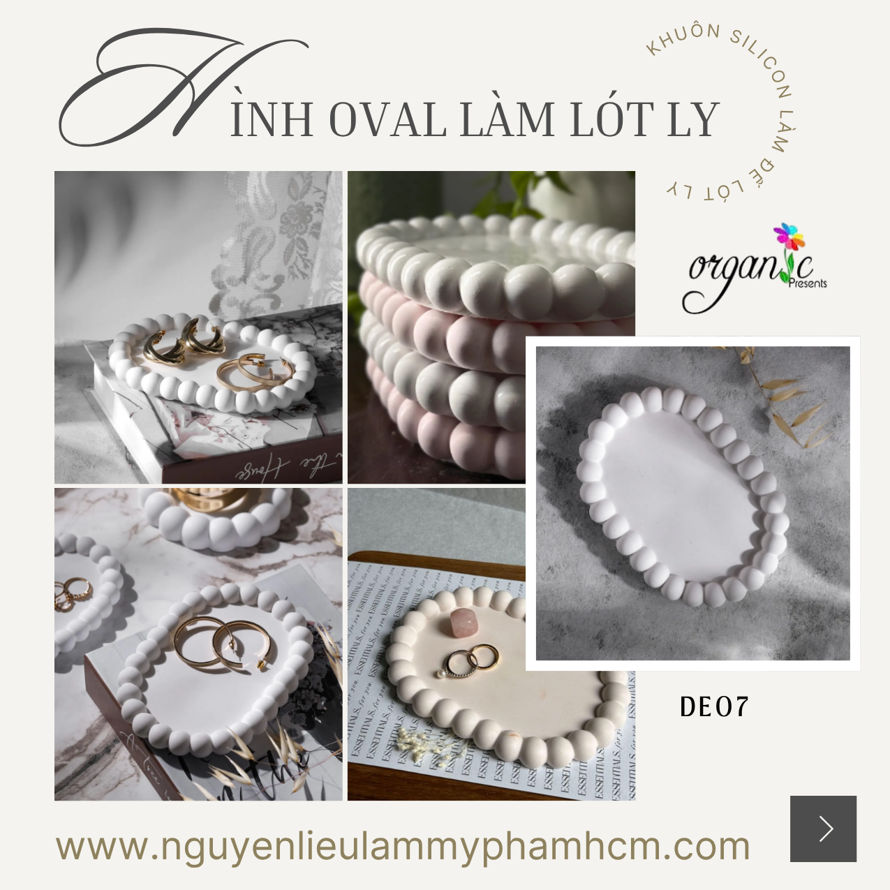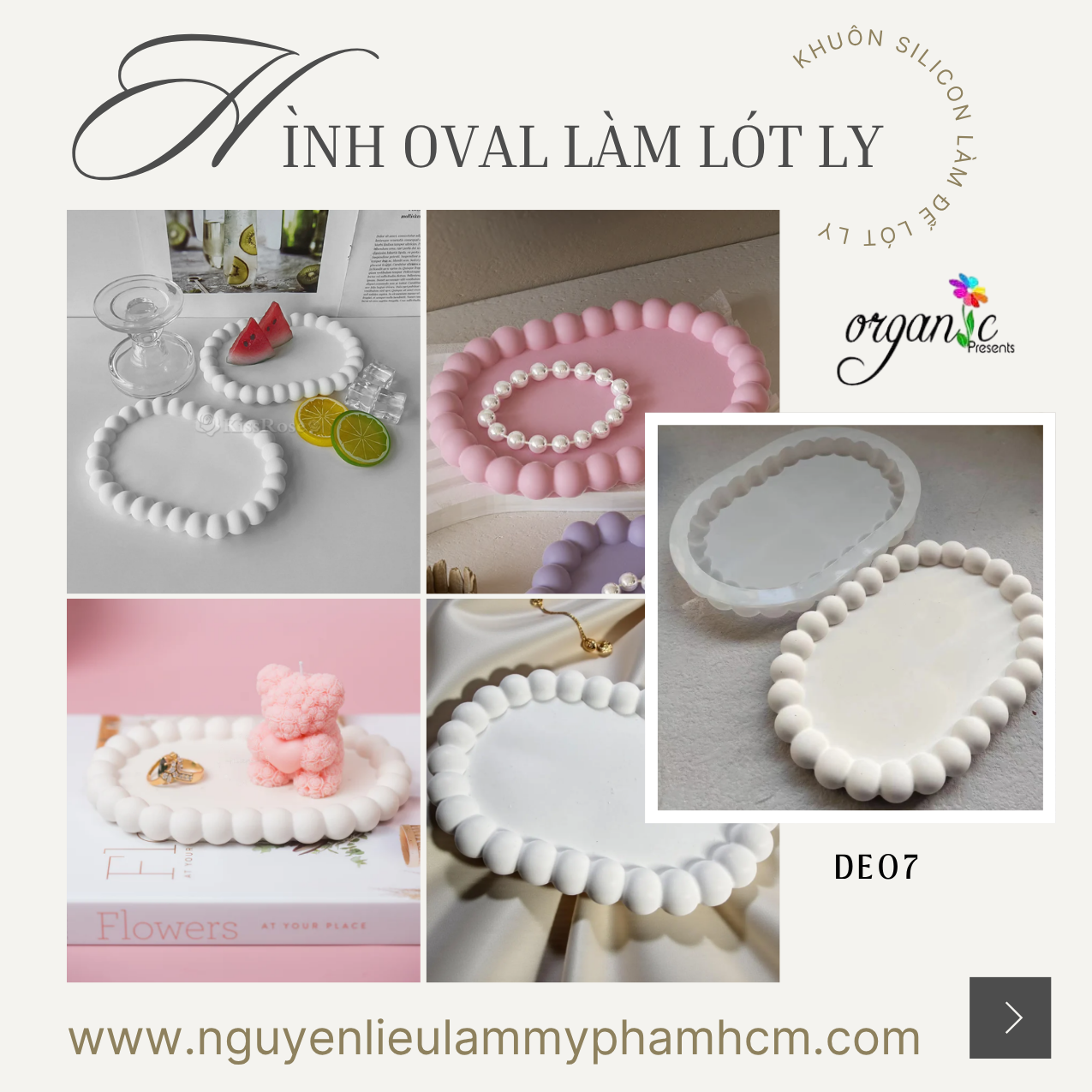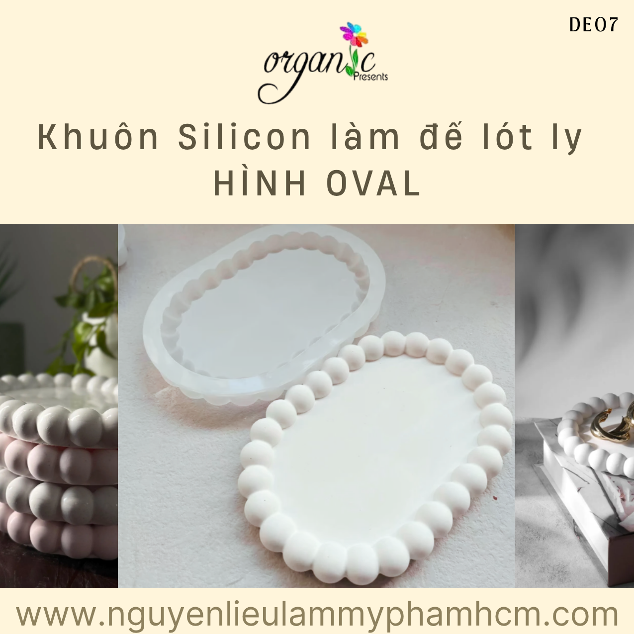 Khuôn silicon làm đế lót ly hình oval DE07 là mẫu khuôn được ưa chuộng trong lĩnh vực handmade và decor nhờ thiết kế mềm mại kết hợp viền hạt nổi tạo điểm nhấn. Dáng oval giúp thành phẩm trông thanh thoát và dễ ứng dụng trong nhiều không gian khác nhau.