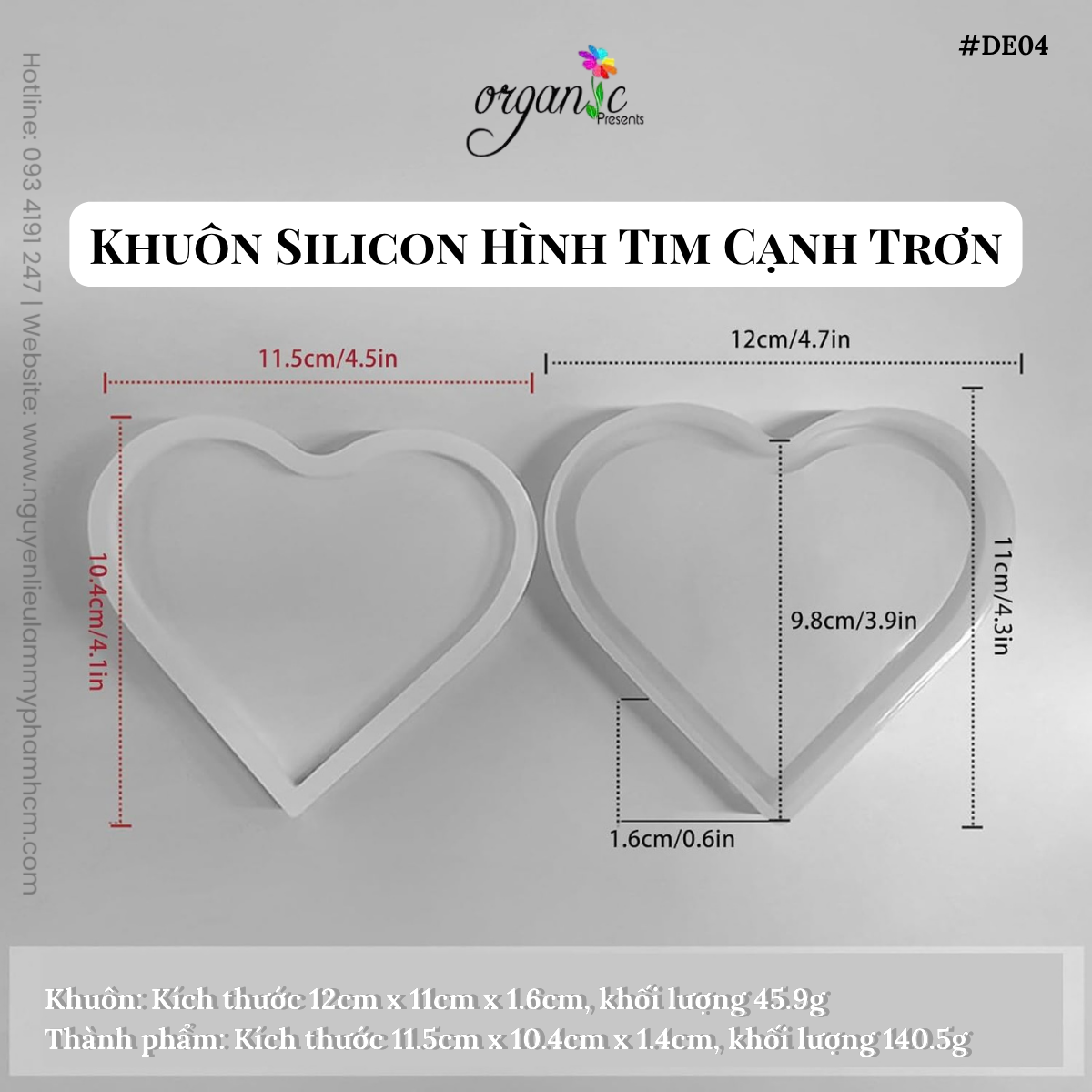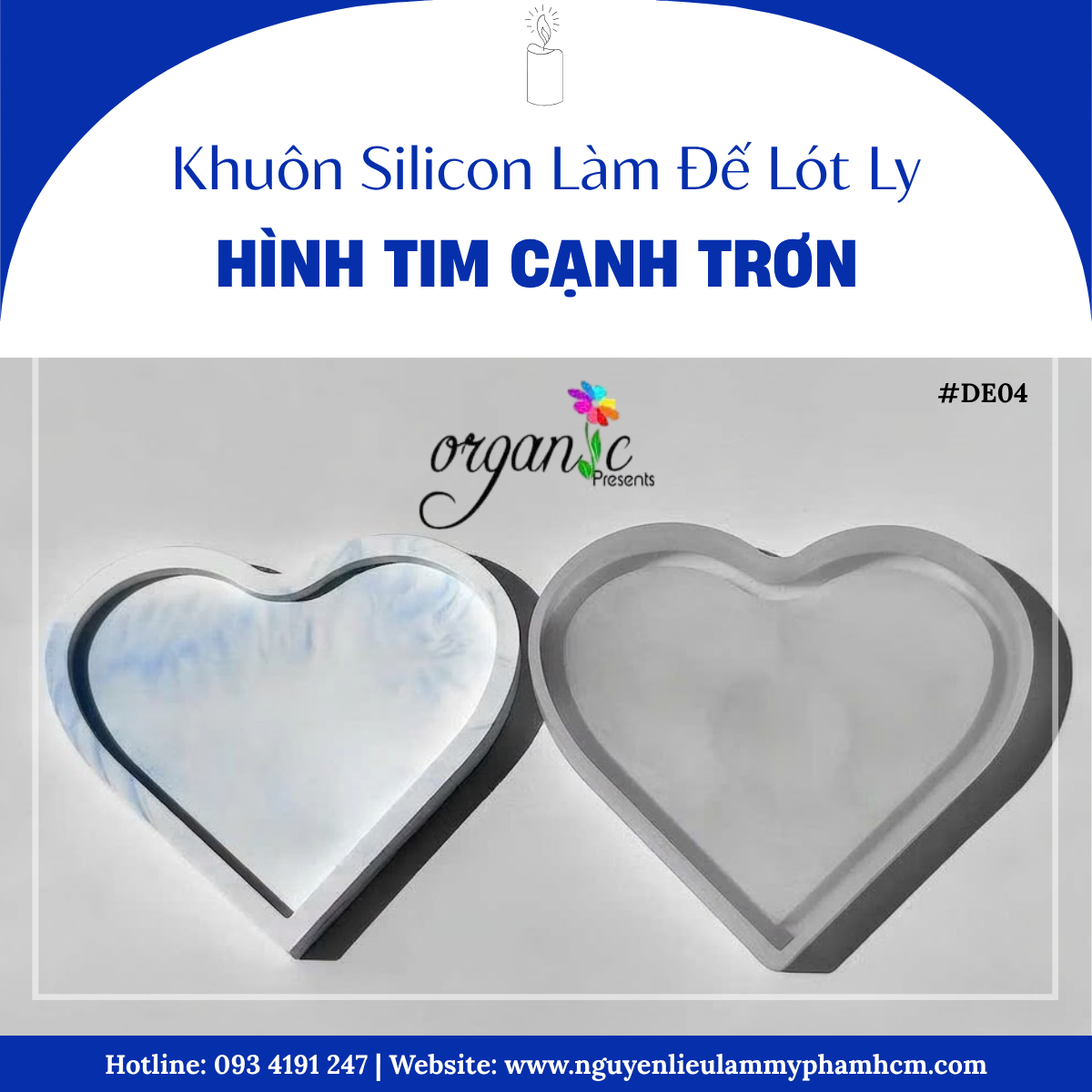Khuôn silicon làm đế lót ly hình tim cạnh trơn DE04 là dụng cụ chuyên dùng trong làm đồ handmade và decor, giúp tạo ra các sản phẩm có hình dáng đồng đều, thẩm mỹ cao. Thiết kế hình trái tim với đường viền trơn, tối giản mang lại cảm giác hiện đại, dễ ứng dụng trong nhiều phong cách trang trí khác nhau.
