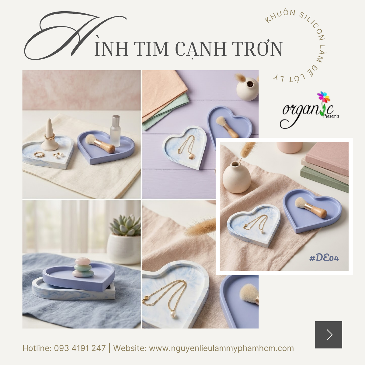 Đổ khay đựng phụ kiện và trang sức: Với hình dáng trái tim đơn giản, bạn có thể sử dụng khuôn để tạo khay đựng nhẫn, vòng tay, dây chuyền hoặc các vật dụng nhỏ. Khi kết hợp với màu nhũ hoặc màu resin, sản phẩm sẽ trở nên nổi bật và mang tính cá nhân cao.