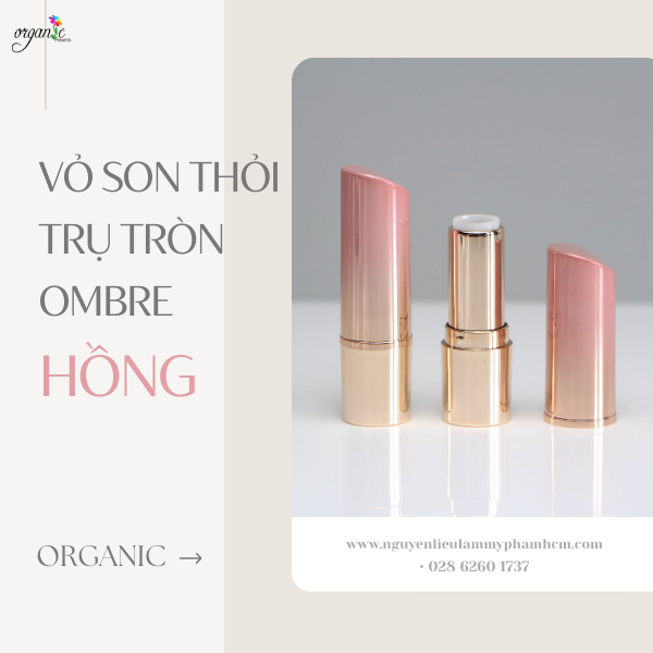 Vỏ son thỏi trụ tròn ombre hồng mang sắc hồng chuyển nhẹ sang ánh kim, tạo cảm giác dịu dàng, nữ tính và thanh lịch. Tông màu này đặc biệt phù hợp với các dòng son dưỡng, son thiên nhiên hoặc sản phẩm hướng đến phong cách nhẹ nhàng, tinh tế.