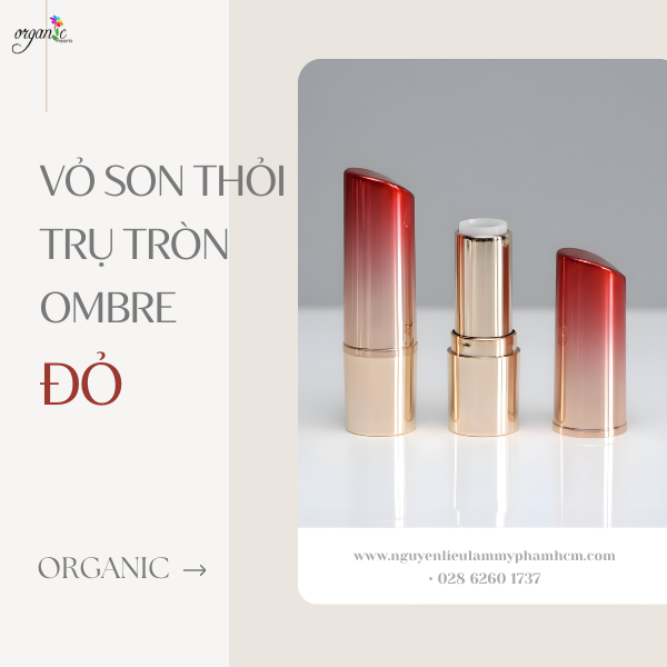 Vỏ son thỏi trụ tròn ombre đỏ nổi bật với hiệu ứng chuyển màu từ đỏ sang ánh kim, tượng trưng cho sự quyến rũ, cá tính và hiện đại. Đây là lựa chọn lý tưởng cho các dòng son màu, son handmade cao cấp hoặc sản phẩm cần tạo ấn tượng thị giác mạnh.