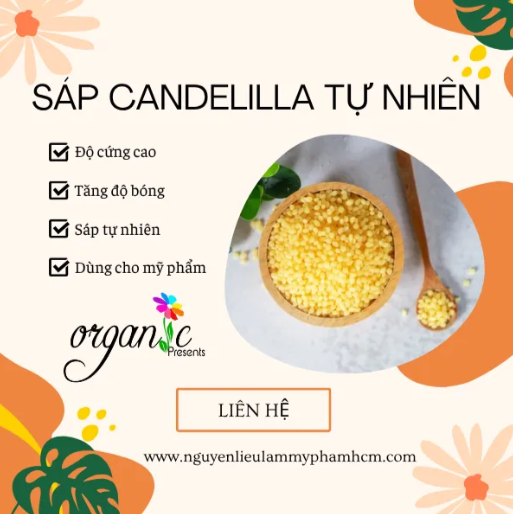 Đây là loại nguyên liệu mỹ phẩm có nguồn gốc thực vật, giúp tạo độ cứng và độ bóng cho thỏi son. Sáp Candelilla còn có khả năng kháng khuẩn nhẹ, giúp bảo vệ môi và tạo cảm giác mượt mà, không gây bết dính khi thoa.
