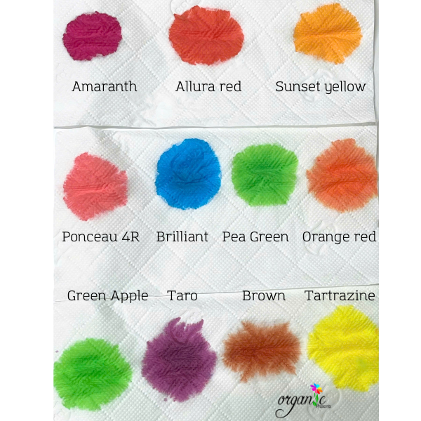 * 11 màu tan nước đã có của Organic. Tỉ lệ 0,05% (0,1g bột/ 50g nước)