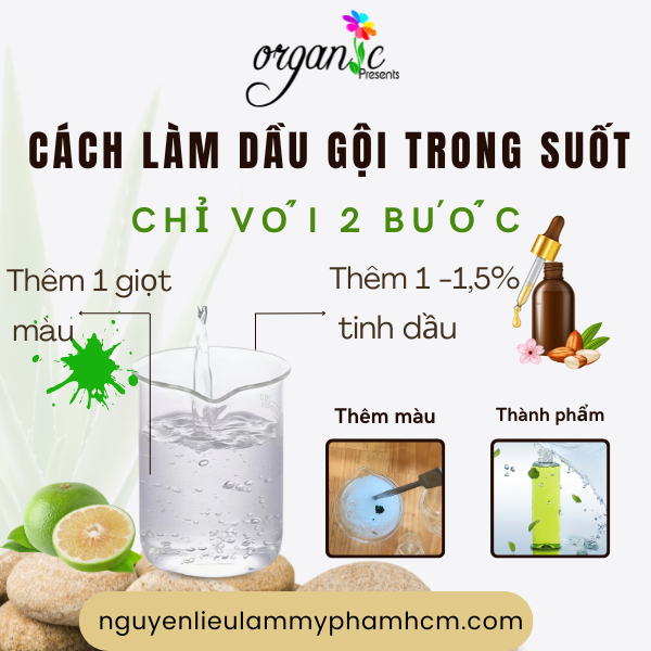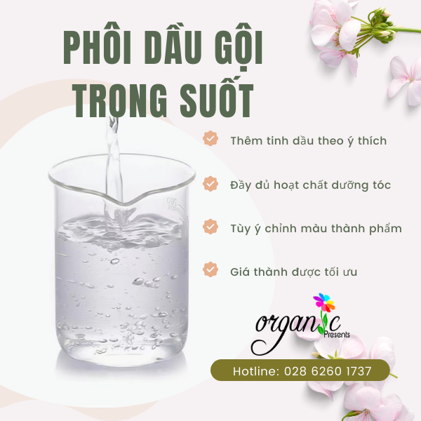 Phong trào dầu gội thảo mộc thiên nhiên đang trở nên rộng rãi trong cộng đồng các bạn gái yêu thích việc làm đẹp tự nhiên. Từ những mong mỏi của khách hàng, Organic giới thiệu với bạn dòng phôi dầu gội trong suốt, cho bạn thỏa sức sáng tạo các dòng sản phẩm dầu gội cho mình nhé. Phôi dầu gội trong suốt bao gồm nhũng thành phần sau: