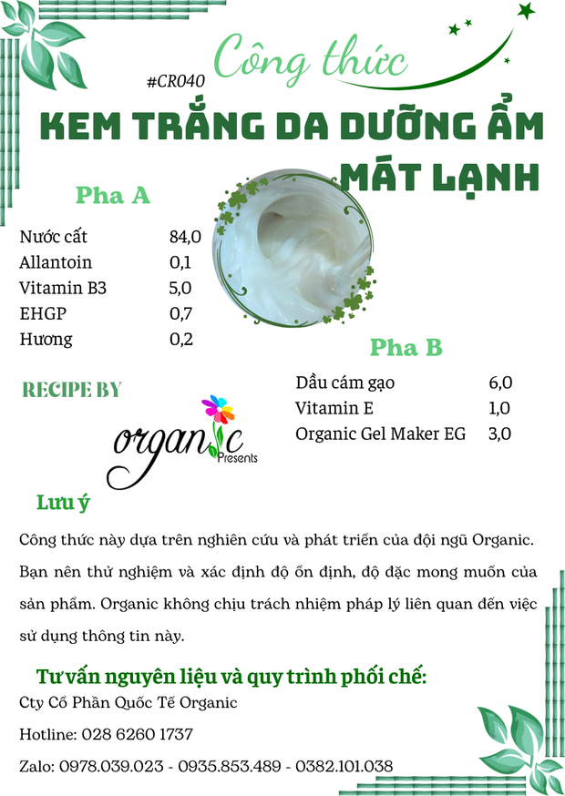 Bạn muốn được hướng dẫn thực hành công thức mỹ phẩm trực tiếp với kỹ thuật viên từ Organic để hiều rõ từng thao tác thực hiện sản phẩm? Hãy liên hệ với Organic để được hổ trợ nhanh nhất bạn nhé!