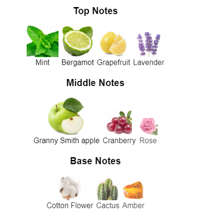 - Nốt đầu: Bạc hà, Cam Bergamot, Quả bưởi và Hoa Oải Hương