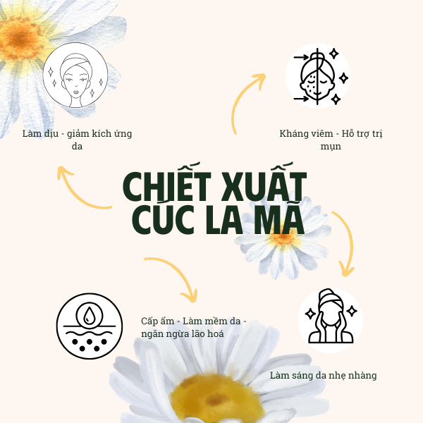 Chiết xuất cúc La Mã nổi bật với khả năng làm dịu da hiệu quả, đặc biệt phù hợp với làn da nhạy cảm, da mẩn đỏ, cháy nắng hoặc sau trị liệu (laser, peel da…). Các hoạt chất như bisabolol và chamazulene giúp giảm cảm giác châm chích, ngứa rát, hỗ trợ phục hồi làn da tổn thương.