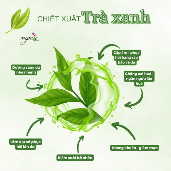Với vitamin C và các chất chống oxy hóa, chiết xuất trà xanh góp phần làm mờ thâm nám, tăng độ đều màu và mang lại làn da tươi sáng tự nhiên.