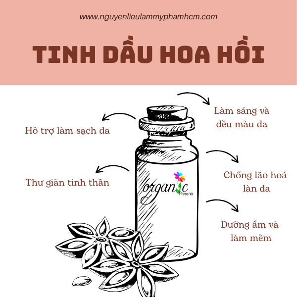 Làm sáng và đều màu da: Tinh dầu hoa hồi giúp loại bỏ tế bào chết, thúc đẩy tái tạo da mới, mang lại làn da sáng mịn và đều màu.
