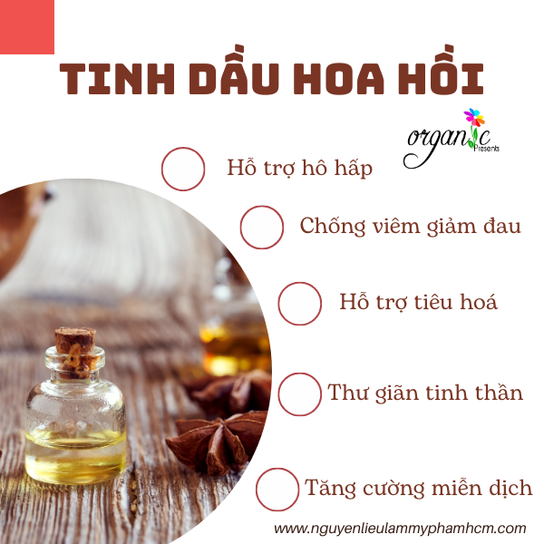 Tinh dầu hoa hồi là tinh dầu tự nhiên được chiết xuất từ quả của cây hoa hồi (Illicium verum), một loại thực vật thường mọc ở khu vực Đông Nam Á, đặc biệt là Việt Nam và Trung Quốc. Tinh dầu này nổi bật với mùi hương ngọt ngào, ấm áp, và cay nhẹ, thường được sử dụng trong liệu pháp hương thơm, làm đẹp và y học cổ truyền.