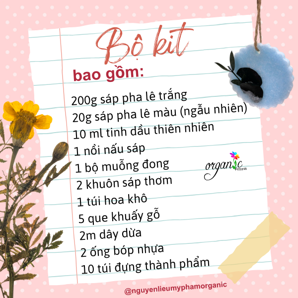 Tất cả thành phần trong bộ kit đều được chọn lọc kỹ, không chứa paraffin, không hương liệu tổng hợp gây hại, và thân thiện với môi trường.