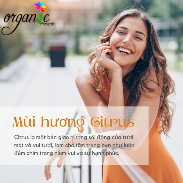 Mỗi khi ngửi mùi hương này, bạn sẽ luôn cảm nhận được sự tươi vui và hạnh phúc, khiến cho những khó khăn và mệt mỏi đều tan biến. Citrus là một mùi hương tạo nên nụ cười trên môi và làm cho cuộc sống trở nên tươi đẹp hơn, giống như một bữa tiệc của niềm vui và sự hạnh phúc luôn nằm trong túi đợi chờ.