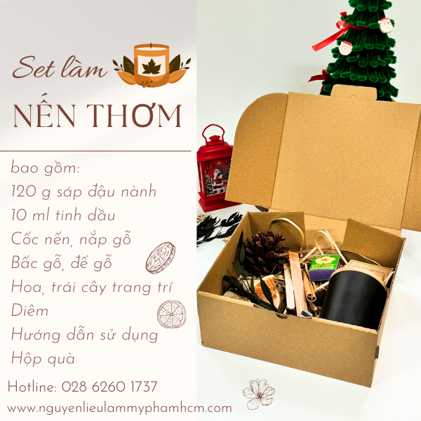 - 1 lọ tinh dầu 10ml: Hương thơm tự chọn để bạn cá nhân hóa nến thơm theo sở thích.